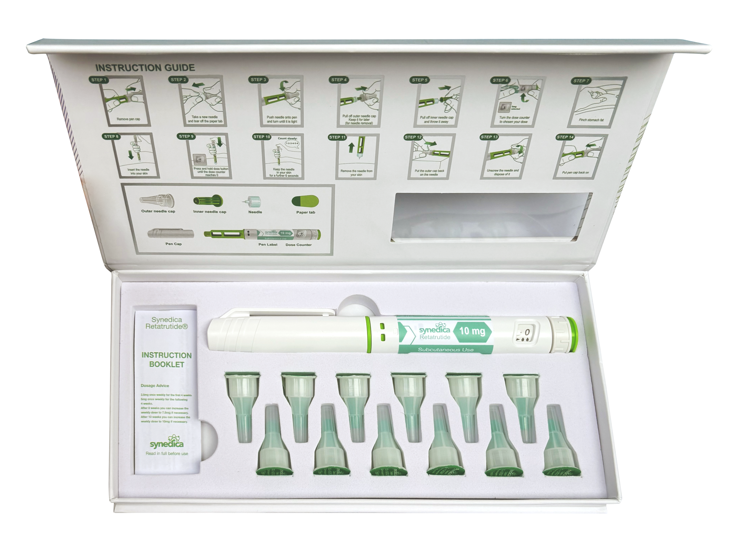 The Synedica Retatrutide® 40mg Injection Pen Kit contains 1 pen, 12 disposable needles and an instruction booklet.